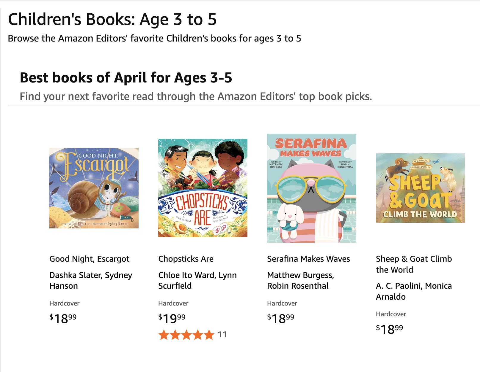Amazon selects Matthew Burgess and Robin Rosenthal’s SERAFINA MAKES WAVES as an April Best Book of the Month (ages 3-5) Editors' Picks Apr 2 Written By Hillary Godwin Hillary Godwin